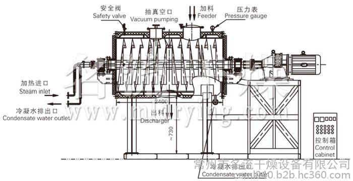 本机是一种新颖卧式间歇式真空干燥设备,湿物料经传导蒸发,带有刮板搅拌器不断清除热面上的物料,并在容器内推移形成循环流,水份蒸发后由真空泵抽出。
